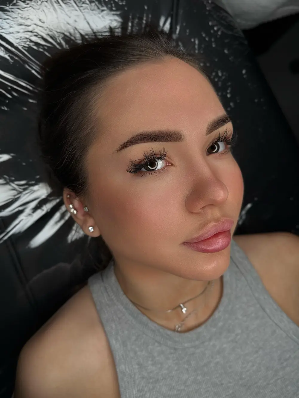 Объёмные ресницы без татуировки века — естественный взгляд.